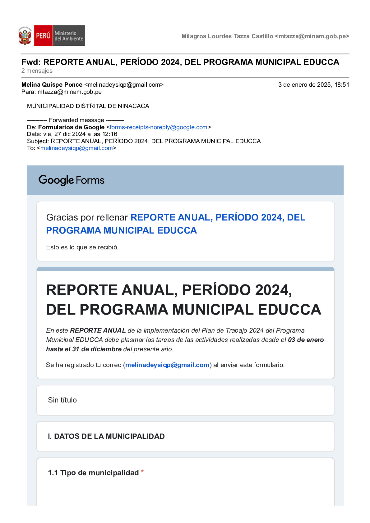 En este Reporte Anual de la implementación del Plan de Trabajo 2024 del Programa Municipal EDUCCA, se presentan las tareas y actividades realizadas durante el período del 3 de enero al 31 de diciembre de 2024. El documento ha sido elaborado por la Municipalidad Distrital de Ninacaca, provincia de Pasco, región Pasco, como parte de sus acciones en el marco del Programa Municipal EDUCCA.