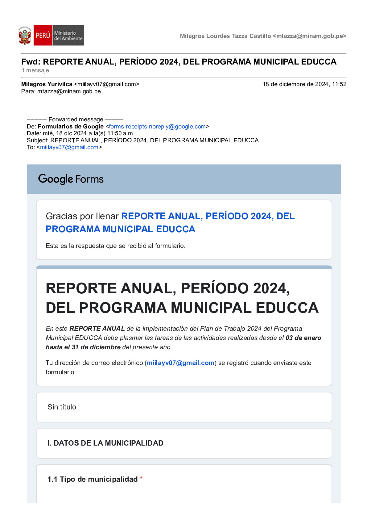 En este Reporte Anual de la implementación del Plan de Trabajo 2024 del Programa Municipal EDUCCA, se presentan las tareas y actividades realizadas durante el período del 3 de enero al 31 de diciembre de 2024. El documento ha sido elaborado por la Municipalidad Distrital de Simón Bolívar, provincia de Pasco, región Pasco, como parte de sus acciones en el marco del Programa Municipal EDUCCA.