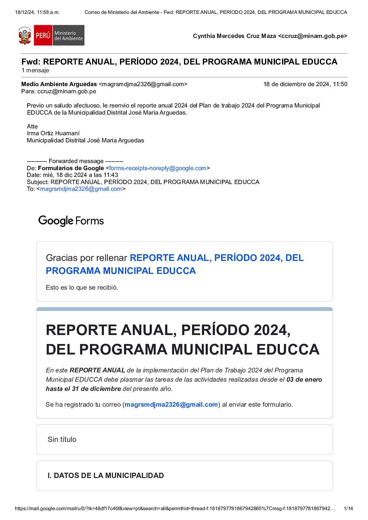 En este Reporte Anual de la implementación del Plan de Trabajo 2024 del Programa Municipal EDUCCA, se presentan las tareas y actividades realizadas durante el período del 3 de enero al 31 de diciembre de 2024. El documento ha sido elaborado por la Municipalidad Distrital de José María Arguedas, provincia de Andahuaylas, región Apurímac, como parte de sus acciones en el marco del Programa Municipal EDUCCA.