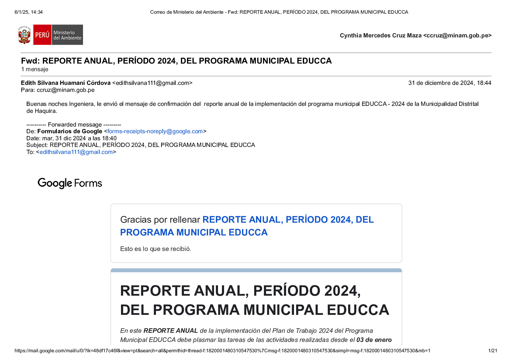 En este Reporte Anual de la implementación del Plan de Trabajo 2024 del Programa Municipal EDUCCA, se presentan las tareas y actividades realizadas durante el período del 3 de enero al 31 de diciembre de 2024. El documento ha sido elaborado por la Municipalidad Distrital de Haquira, provincia de Cotabambas, región Apurímac, como parte de sus acciones en el marco del Programa Municipal EDUCCA.