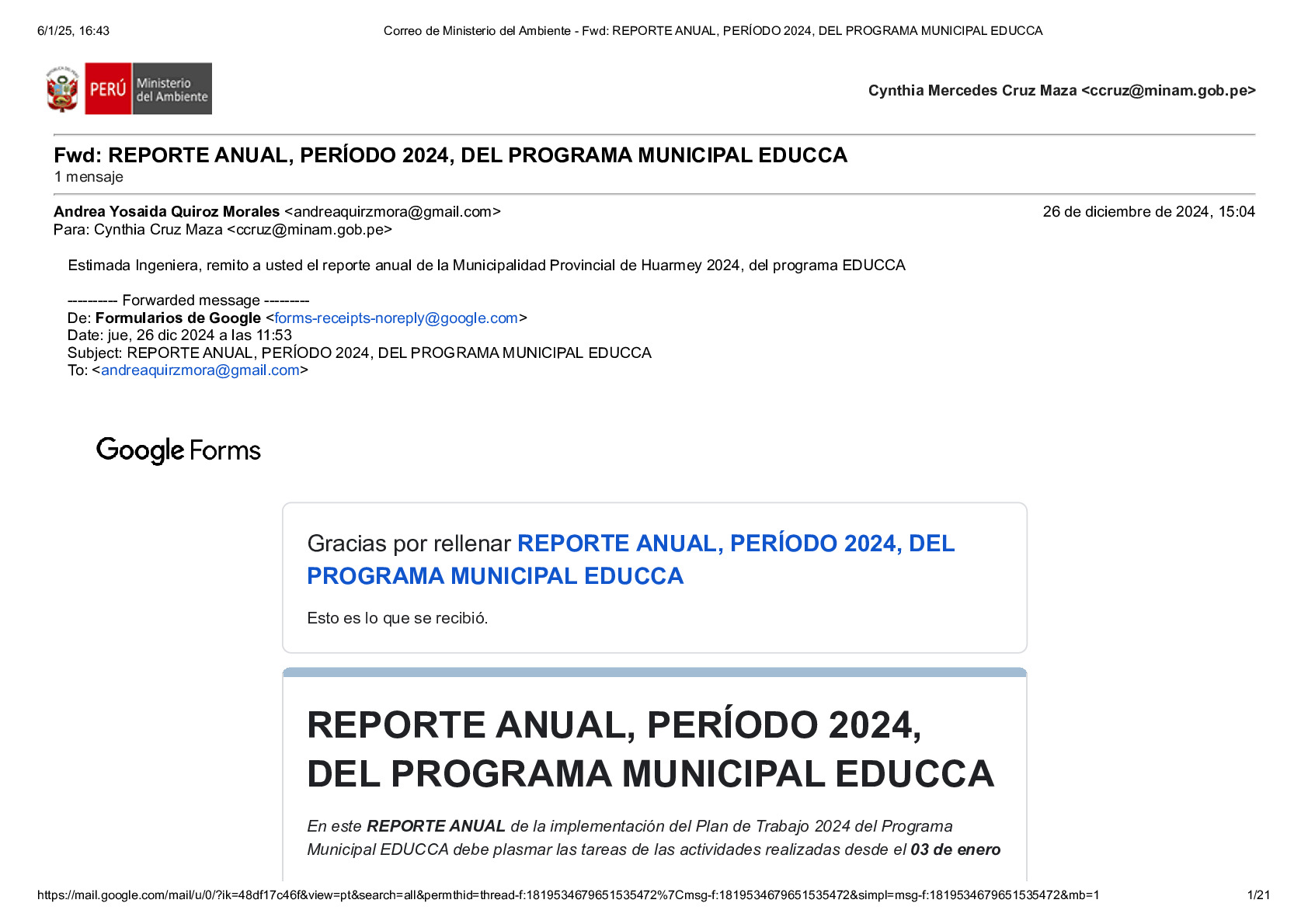 En este Reporte Anual de la implementación del Plan de Trabajo 2024 del Programa Municipal EDUCCA, se presentan las tareas y actividades realizadas durante el período del 3 de enero al 31 de diciembre de 2024. El documento ha sido elaborado por la Municipalidad Provincial de Huarmey, provincia de Huarmey, región Áncash, como parte de sus acciones en el marco del Programa Municipal EDUCCA.