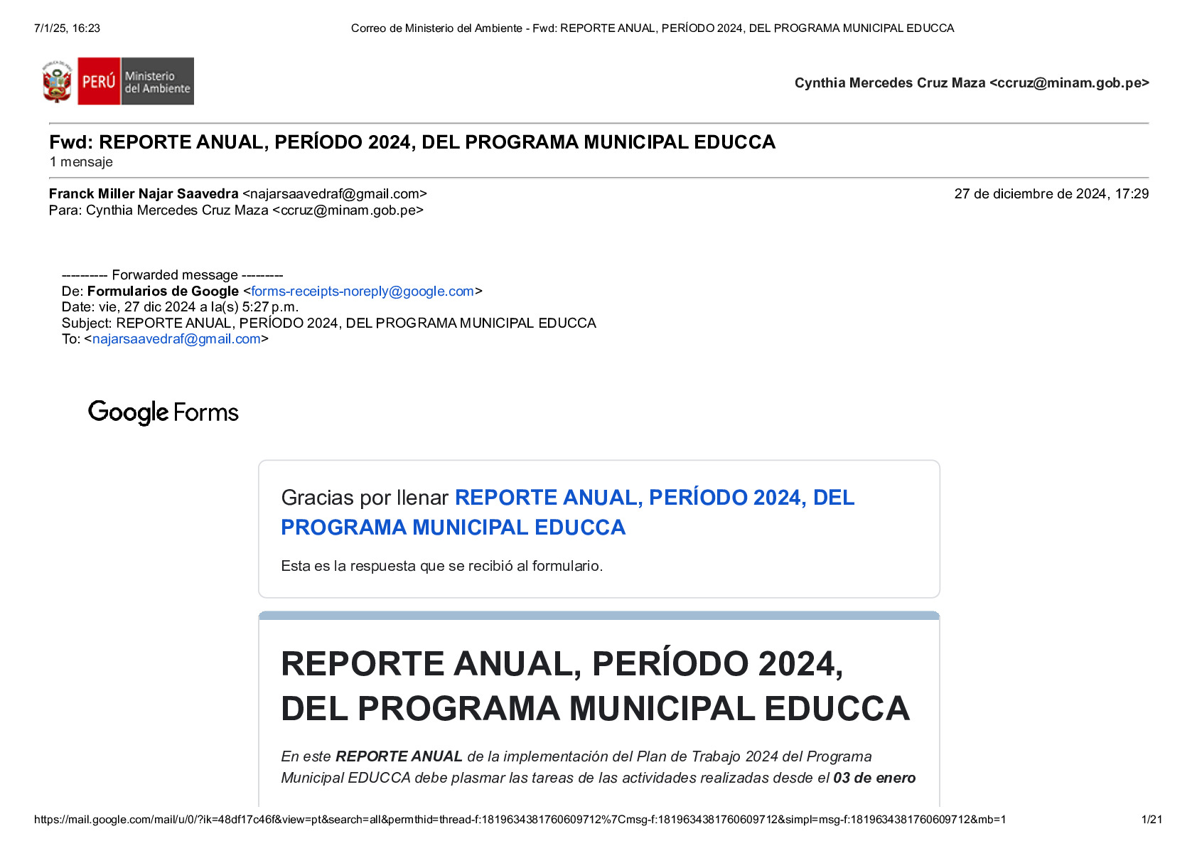 En este Reporte Anual de la implementación del Plan de Trabajo 2024 del Programa Municipal EDUCCA, se presentan las tareas y actividades realizadas durante el período del 3 de enero al 31 de diciembre de 2024. El documento ha sido elaborado por la Municipalidad Distrital de Sarayacu, provincia de Ucayali, región Loreto, como parte de sus acciones en el marco del Programa Municipal EDUCCA.