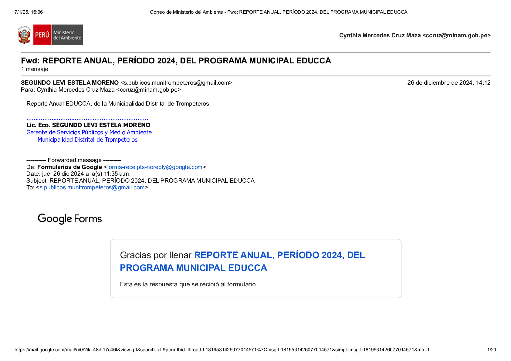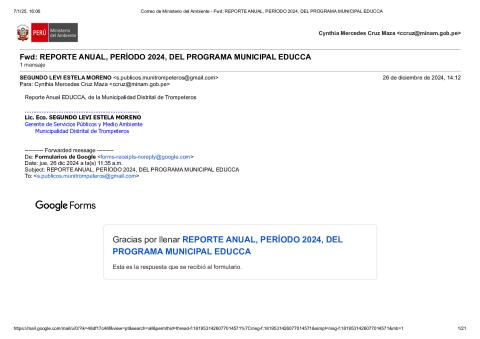 En este Reporte Anual de la implementación del Plan de Trabajo 2024 del Programa Municipal EDUCCA, se presentan las tareas y actividades realizadas durante el período del 3 de enero al 31 de diciembre de 2024. El documento ha sido elaborado por la Municipalidad Distrital de Trompeteros, provincia de Loreto, región Loreto, como parte de sus acciones en el marco del Programa Municipal EDUCCA.