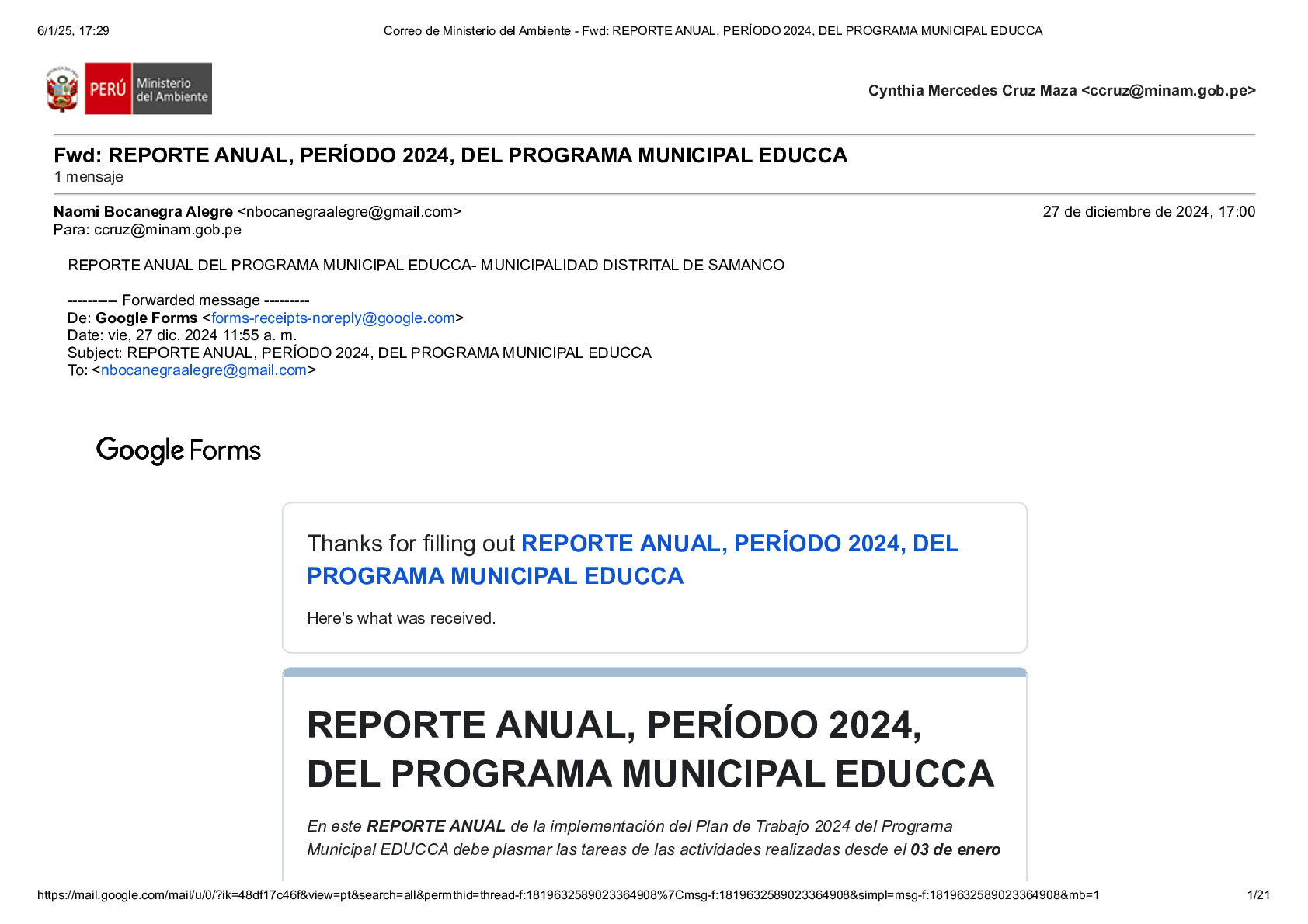 En este Reporte Anual de la implementación del Plan de Trabajo 2024 del Programa Municipal EDUCCA, se presentan las tareas y actividades realizadas durante el período del 3 de enero al 31 de diciembre de 2024. El documento ha sido elaborado por la Municipalidad Distrital de Samanco, provincia de Santa, región Áncash, como parte de sus acciones en el marco del Programa Municipal EDUCCA.