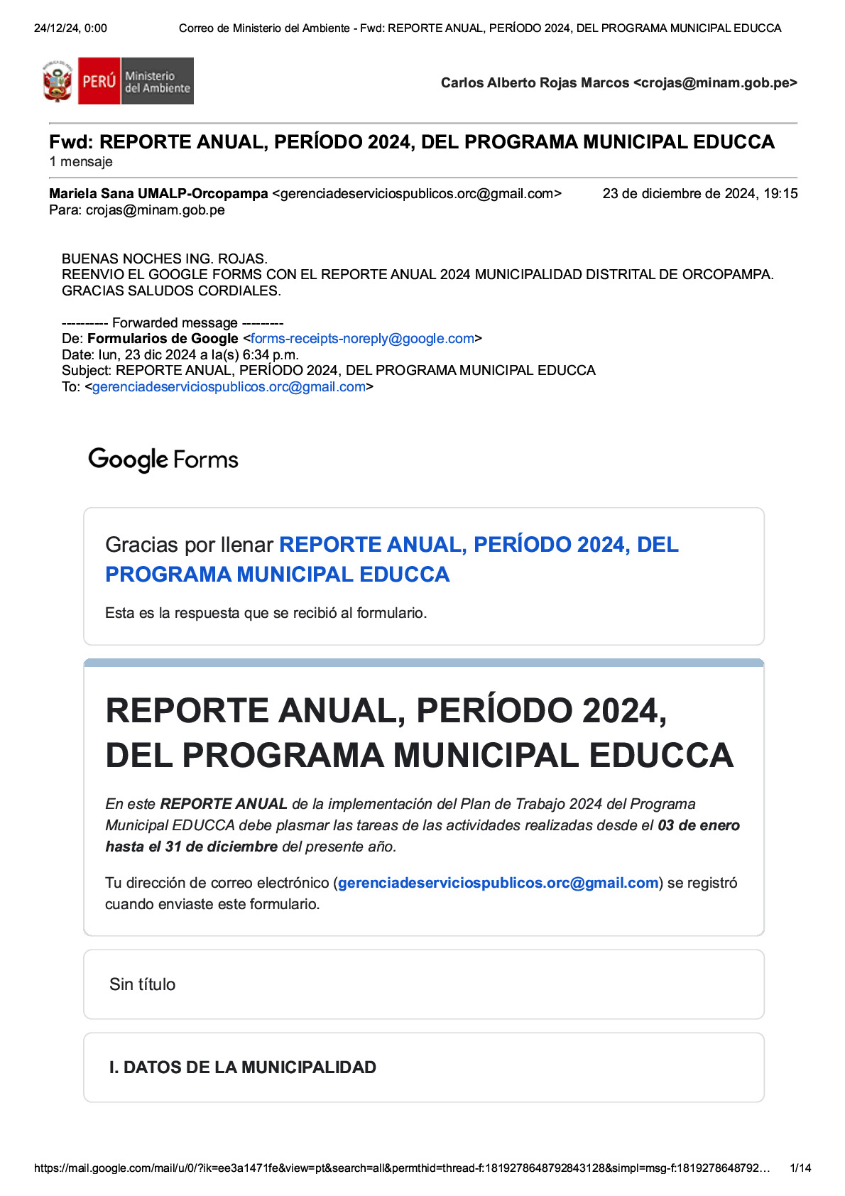En este Reporte Anual de la implementación del Plan de Trabajo 2024 del Programa Municipal EDUCCA, se presentan las tareas y actividades realizadas durante el período del 3 de enero al 31 de diciembre de 2024. El documento ha sido elaborado por la Municipalidad Distrital de Orcopampa, provincia de Castilla, región Arequipa, como parte de sus acciones en el marco del Programa Municipal EDUCCA.