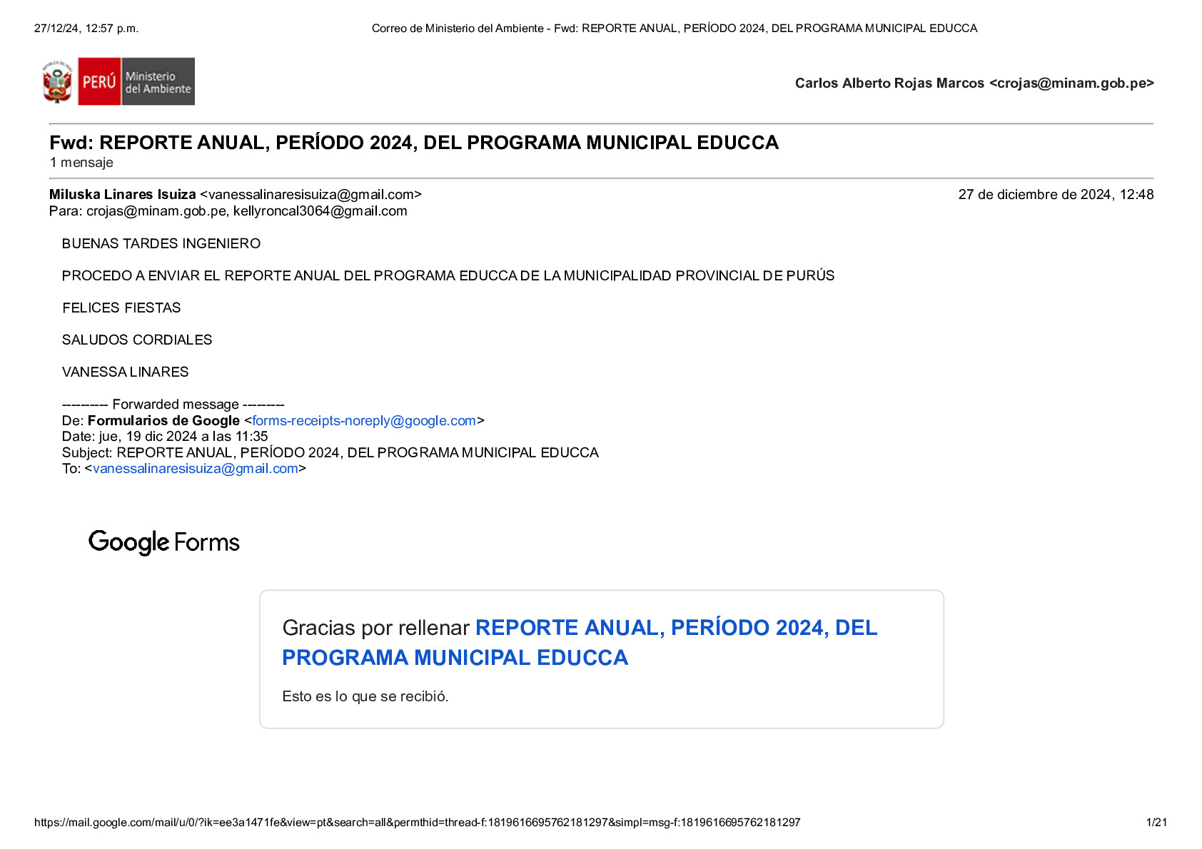En este Reporte Anual de la implementación del Plan de Trabajo 2024 del Programa Municipal EDUCCA, se presentan las tareas y actividades realizadas durante el período del 3 de enero al 31 de diciembre de 2024. El documento ha sido elaborado por la Municipalidad Provincial de Purús, provincia de Purús, región Ucayali, como parte de sus acciones en el marco del Programa Municipal EDUCCA.
