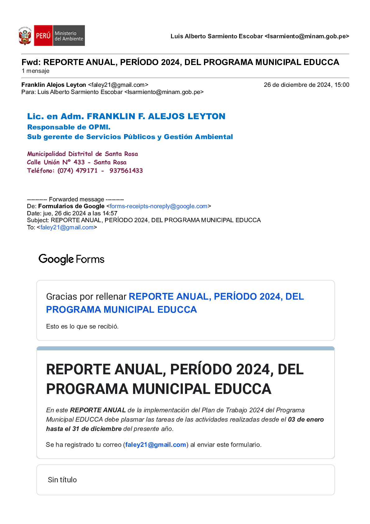 En este Reporte Anual de la implementación del Plan de Trabajo 2024 del Programa Municipal EDUCCA, se presentan las tareas y actividades realizadas durante el período del 3 de enero al 31 de diciembre de 2024. El documento ha sido elaborado por la Municipalidad Distrital de Santa Rosa, provincia de Chiclayo, región Lambayeque, como parte de sus acciones en el marco del Programa Municipal EDUCCA.