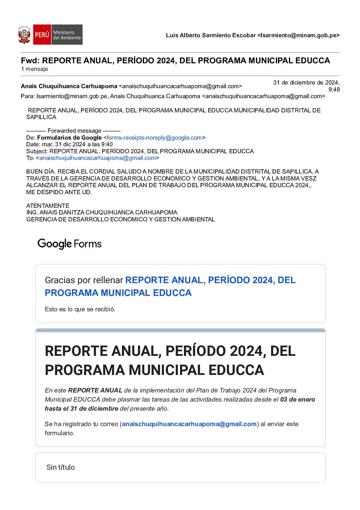 En este Reporte Anual de la implementación del Plan de Trabajo 2024 del Programa Municipal EDUCCA, se presentan las tareas y actividades realizadas durante el período del 3 de enero al 31 de diciembre de 2024. El documento ha sido elaborado por la Municipalidad Distrital de Sapillica, provincia de Ayabaca, región Piura, como parte de sus acciones en el marco del Programa Municipal EDUCCA.