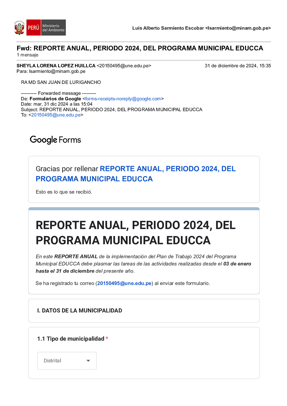 En este Reporte Anual de la implementación del Plan de Trabajo 2024 del Programa Municipal EDUCCA, se presentan las tareas y actividades realizadas durante el período del 3 de enero al 31 de diciembre de 2024. El documento ha sido elaborado por la Municipalidad Distrital de San Juan de Lurigancho, provincia de Lima, región Lima Metropolitana, como parte de sus acciones en el marco del Programa Municipal EDUCCA.