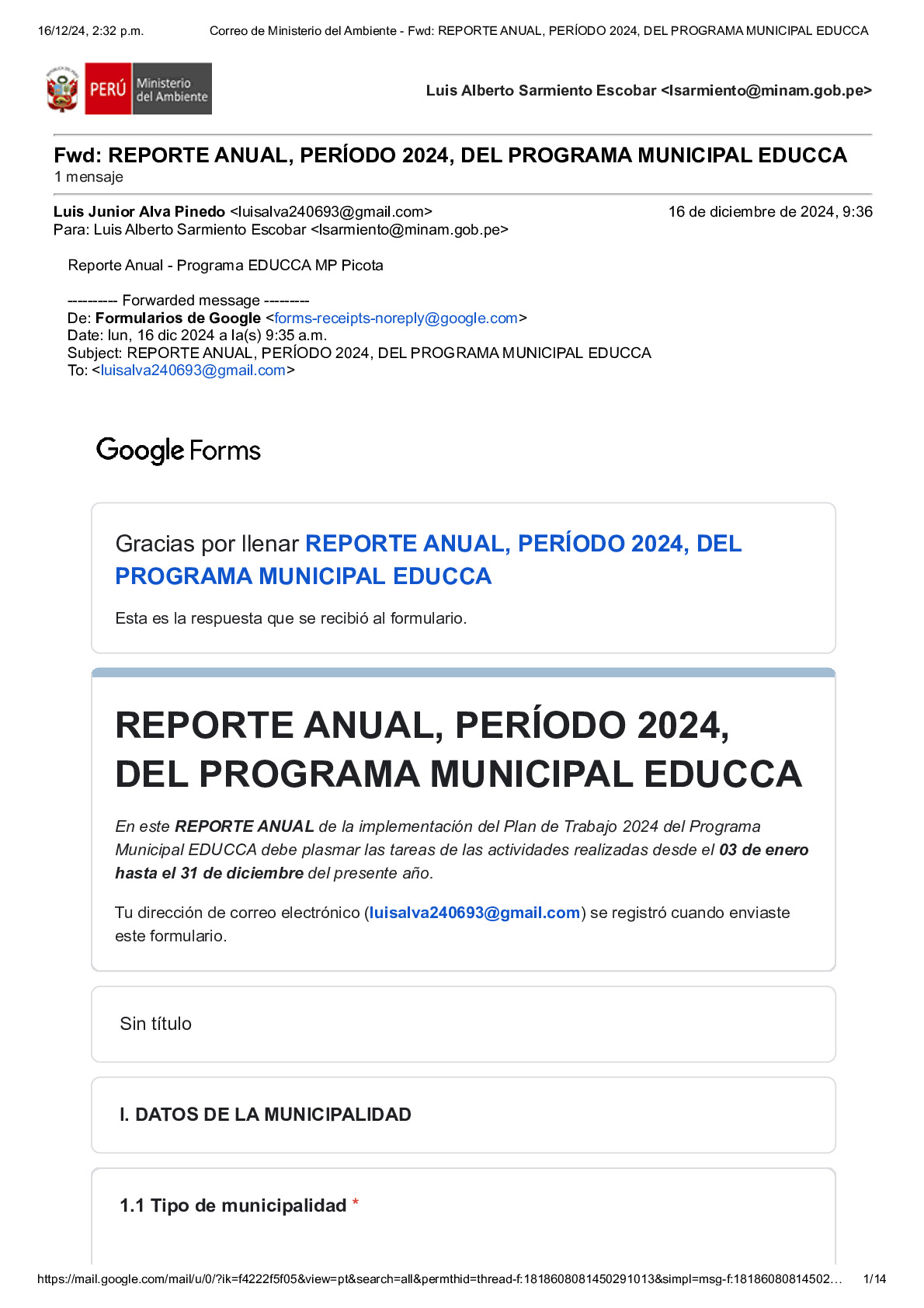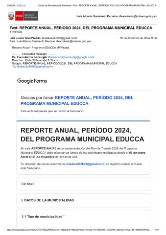 En este Reporte Anual de la implementación del Plan de Trabajo 2024 del Programa Municipal EDUCCA, se presentan las tareas y actividades realizadas durante el período del 3 de enero al 31 de diciembre de 2024. El documento ha sido elaborado por la Municipalidad Provincial de Picota, provincia de Picota, región San Martín, como parte de sus acciones en el marco del Programa Municipal EDUCCA.