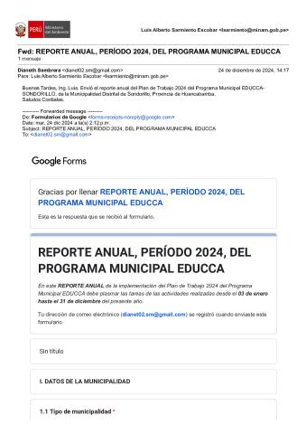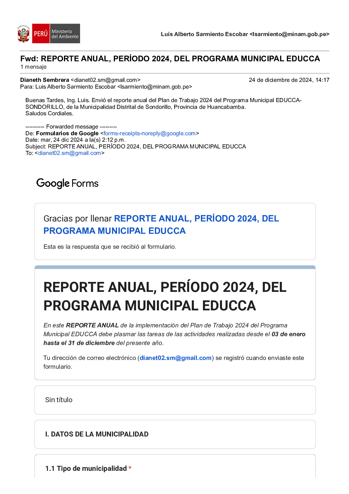En este Reporte Anual de la implementación del Plan de Trabajo 2024 del Programa Municipal EDUCCA, se presentan las tareas y actividades realizadas durante el período del 3 de enero al 31 de diciembre de 2024. El documento ha sido elaborado por la Municipalidad Distrital de Sondorillo, provincia de Huancabamba, región Piura, como parte de sus acciones en el marco del Programa Municipal EDUCCA.
