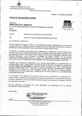 Reporte anual de denuncias ambientales de la Municipalidad Provincial del Callao del periodo 2021