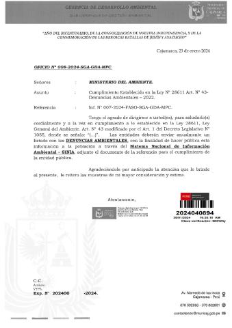 La entidad remite al Ministerio del Ambiente información sobre las denuncias ambientales en cumplimiento de lo establecido en el Decreto Legislativo N° 1055 que modifica el artículo 43° de la Ley N° 28611, que indica que "Las entidades deberán enviar anualmente un listado con las denuncias recibidas y soluciones alcanzadas, con la finalidad de hacer pública esta información a lav población a través del SINIA".