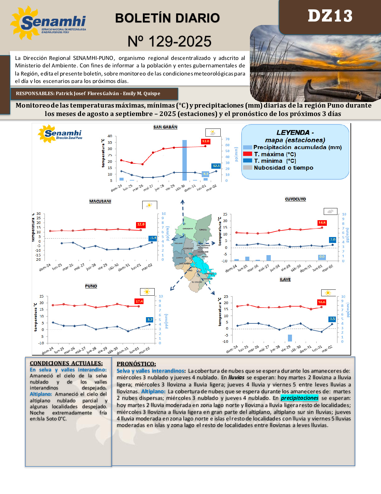 La Dirección Regional SENAMHI-PUNO, organismo regional descentralizado y adscrito al Ministerio del Ambiente. Con fines de informar a la población y entes gubernamentales de la Región, edita el presente boletín, sobre monitoreo de las condiciones meteorológicas para el día y los escenarios para los próximos días.