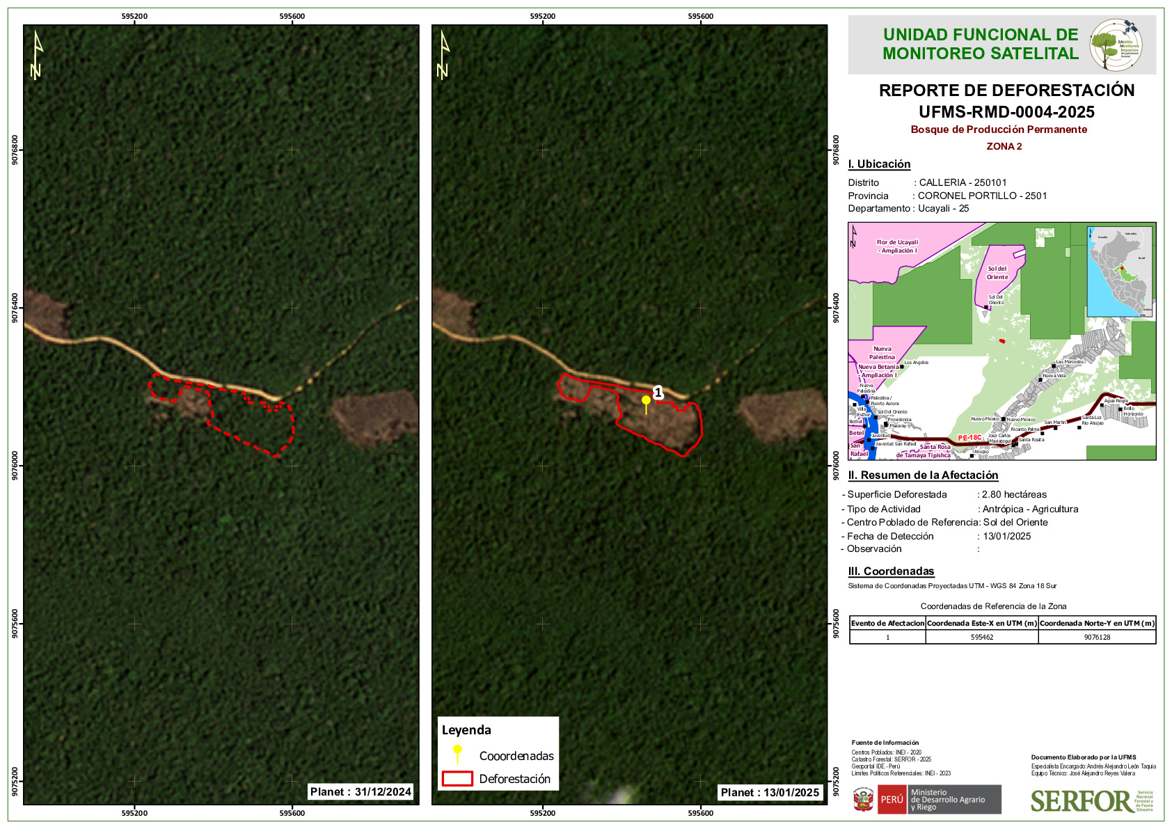 La Unidad Funcional de Monitoreo Satelital del SERFOR, a través del Reporte de Reforestación UFMS-RMD-0004-2025, da a conocer la afectación por deforestación sobre zonas de Bosque de Producción Permanente en el distrito de Callería , provincia de Coronel Portillo, departamento de Ucayali.