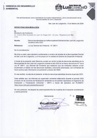 Reporte de denuncias ambientales del 2023 de la Municipalidad Distrital de San Juan de Lurigancho