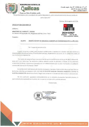 Reporte de denuncias ambientales presentados en la municipalidad distrital de Quilcas 2023