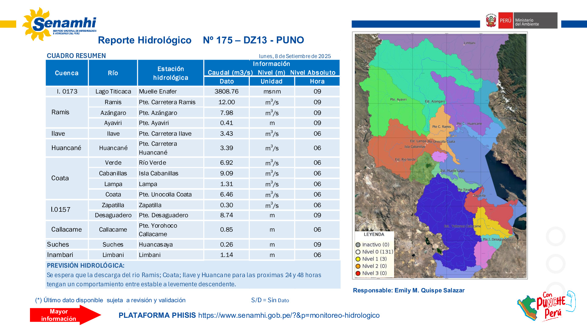 La Dirección Zonal 13 (DZ 13 Puno) del SENAMHI, presenta el Reporte Hidrológico N° 175-DZ13-Puno, de las cuencas hidrográficas de la Vertiente del Titicaca, una cuenca endorreica donde los ríos alimentan al lago Titicaca en la meseta del Collao, correspondiente al 08 de setiembre de 2025. Así como el comportamiento actual del lago Titicaca - Comparaciones de años de "El Niño".
