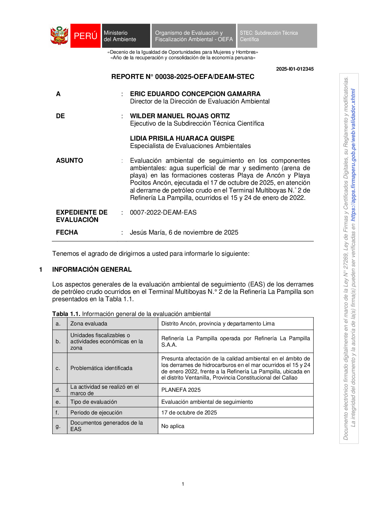Evaluación ambiental de seguimiento en los componentes ambientales: agua superficial de mar y sedimento (arena de playa) en las formaciones costeras Playa de Ancón y Playa Pocitos Ancón, ejecutada el 17 de octubre de 2025, en atención al derrame de petróleo crudo en el Terminal Multiboyas N.° 2 de Refinería La Pampilla, ocurridos el 15 y 24 de enero de 2022.