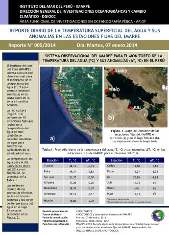 El Instituto del Mar del Perú (IMARPE) cuenta con una red observacional para el monitoreo de la temperatura del agua (T, ºC) que permite detectar anomalías en la costa como en la zona altoandina peruana.