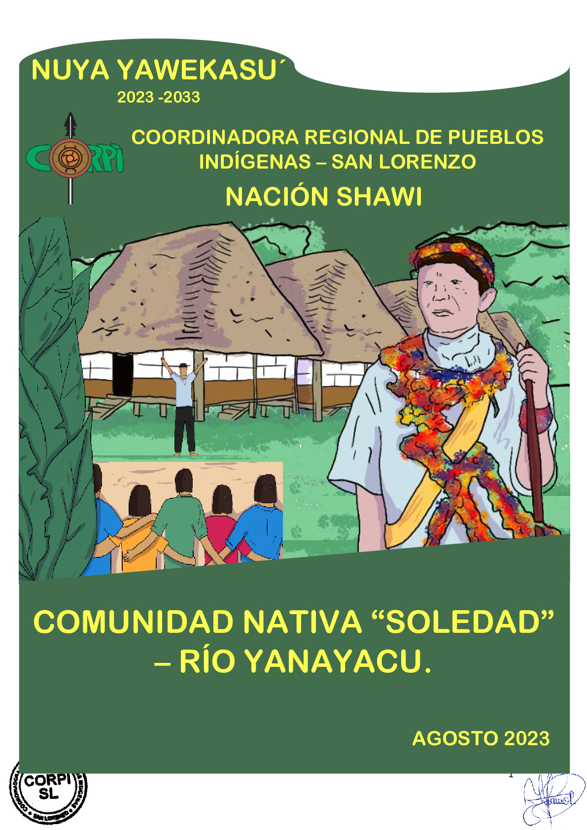 El Plan de Vida "Nuya Yawekasu" de la comunidad Shawi de Soledad, ubicada en el río Yanayacu, es una guía estratégica para alcanzar el bienestar colectivo y la protección territorial. Este documento, validado en agosto de 2023, diagnostica la situación actual de la población y establece metas claras para la próxima década. La comunidad prioriza la defensa de sus recursos naturales frente a amenazas externas, así como el saneamiento legal de sus tierras. En el ámbito social, busca mejorar el acceso a servicios básicos, salud intercultural y una educación que revalorice la lengua y tradiciones Shawi. La estrategia económica se centra en la seguridad alimentaria y el aprovechamiento sostenible de productos locales como el cacao y la artesanía. Asimismo, se promueve el fortalecimiento de la gobernanza indígena y la participación activa de mujeres y jóvenes. El plan fue facilitado por CORPI-SL con el objetivo de consolidar una comunidad autónoma, saludable y orgullosa de su identidad amazónica.