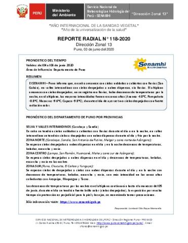 SENAMHI-DZ13 Puno: Reporte radial de 03 de junio del 2020