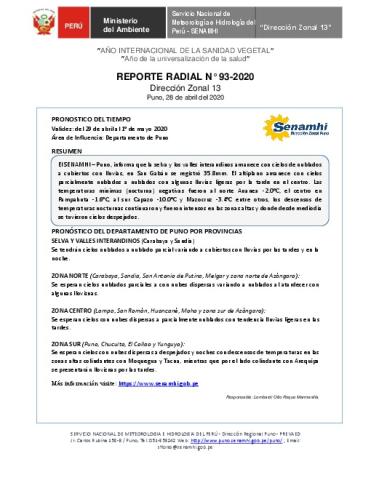 SENAMHI-DZ13 Puno: Reporte radial de 28 de abril del 2020