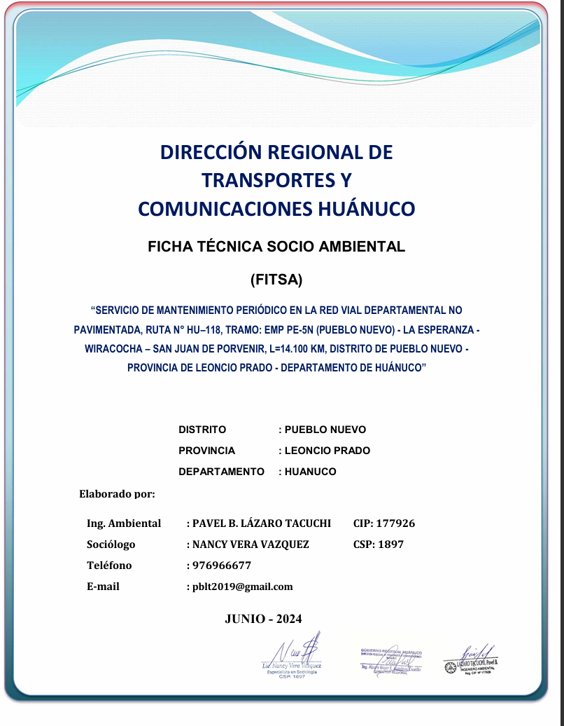 Servicio de mantenimiento periódico en la red vial departamental no pavimentada, ruta N° hu-118, tramo: emp pe-5n (Pueblo Nuevo) La Esperanza – Wiracocha - San Juan de Porvenir, l=14.100 km, distrito de Pueblo Nuevo - provincia de Leoncio Prado