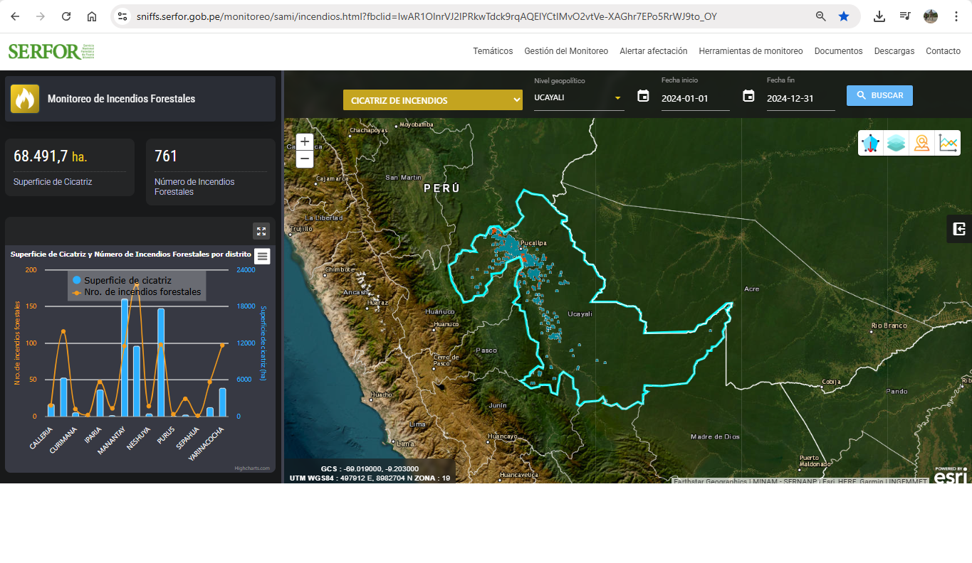 Mediante la plataforma web SAMI del sub módulo Monitoreo Satelital de los Impactos al Patrimonio Forestal del Módulo de Monitoreo del Patrimonio Forestal del Sistema Nacional Forestal y de Fauna Silvestre (SNIFFS) del Servicio Nacional Forestal y de Fauna Silvestre (SERFOR), se realizó el monitoreo de Monitoreo de Incendios Forestales de la región Ucayali correspondiente al año 2024.
