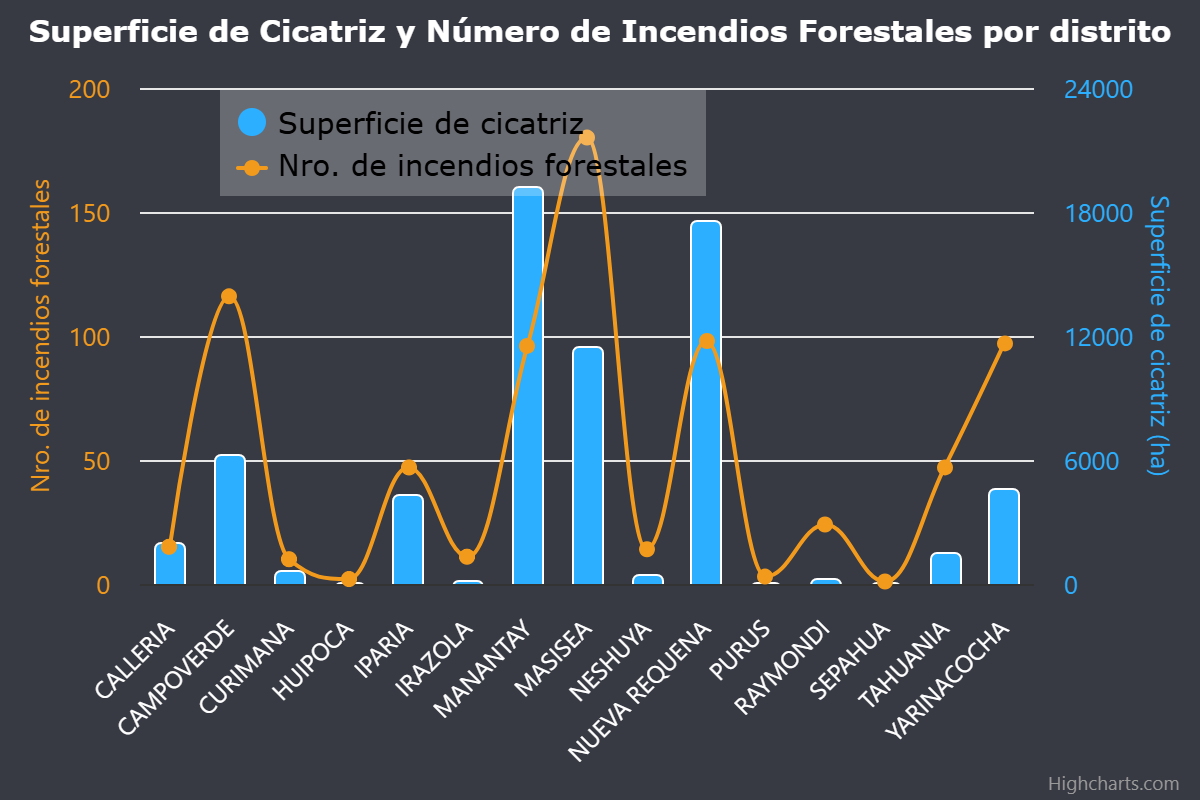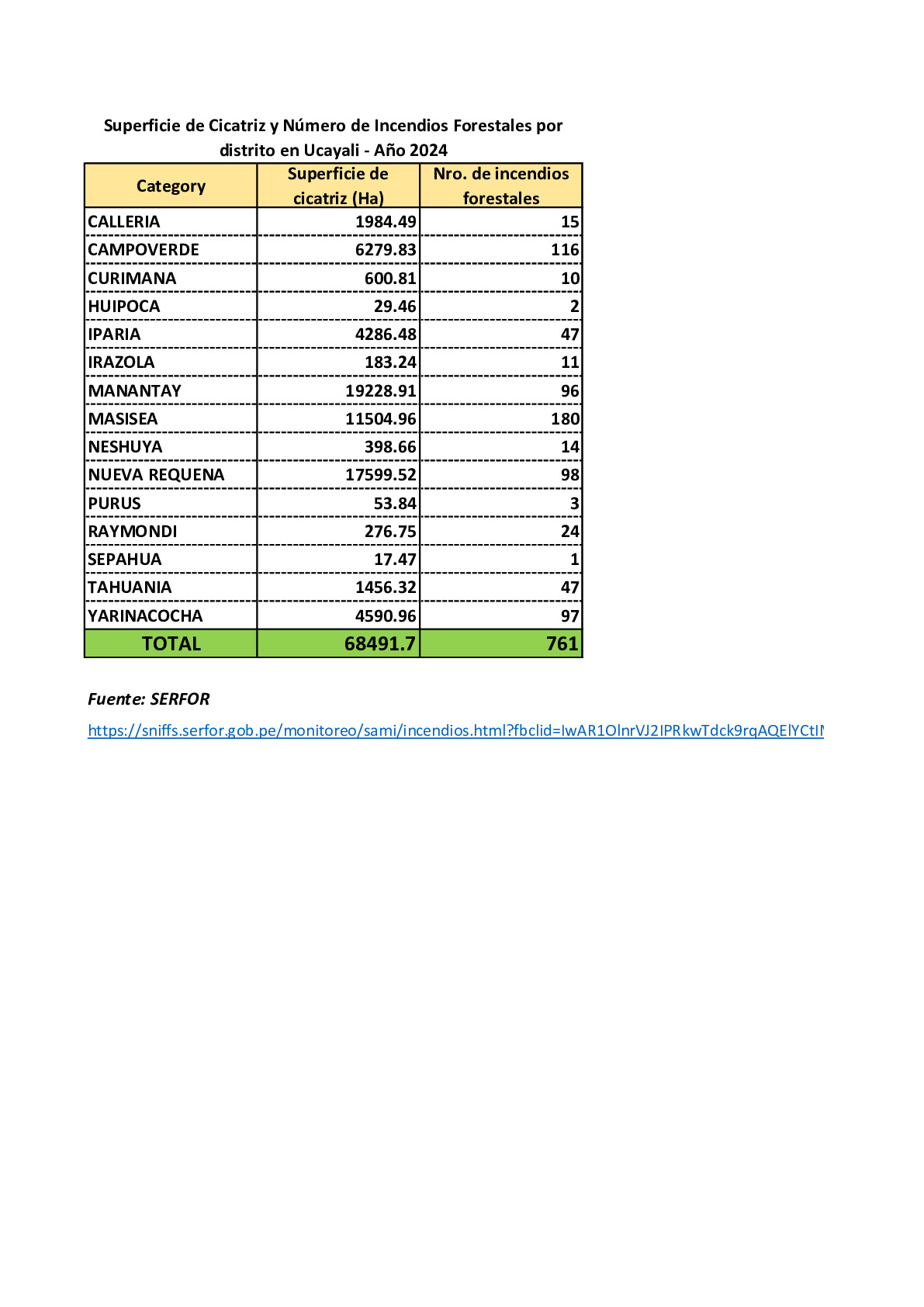 Superficie de Cicatriz y Número de Incendios Forestales por distrito en Ucayali - Año 2024
