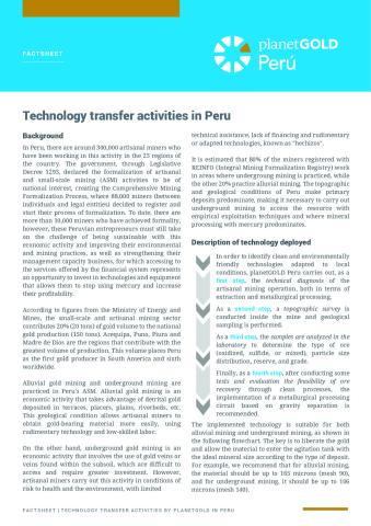 Factsheet that addresses the context of Artisanal and Small-Scale Mining (ASM) in Peru, where approximately 300,000 miners work. Despite the sector contributing 20% (20 tons) of the national gold production, with Arequipa, Puno, Piura, and Madre de Dios being the regions with the highest volume, miners still face the challenge of sustainability and the adoption of clean technologies to stop using mercury. The project outlines a four-step process—including technical diagnosis, geological sampling, and lab analysis—to recommend a metallurgical processing circuit based on gravity separation. This technology is suitable for both alluvial and underground mining and has demonstrated an average gold recovery efficiency of 90%. To date, 9 gravity plants have been transferred in the regions of Puno and Arequipa, with 6 more pending transfer in 2023. The equipment transferred is co-financed by the miners, reflecting their commitment to technological change, and the project provides technical support and training to miners and professionals in collaboration with regional governments.