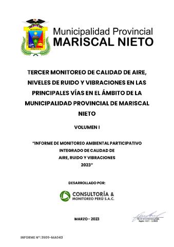 La Municipalidad Provincial Mariscal Nieto en el año 2021 solicitó el apoyo técnico a la empresa Anglo American Quellaveco, con el objetivo de monitorear la calidad de aire, ruido y vibraciones en las vías de alto tránsito vehicular en la ciudad de Moquegua, lo cual, permitira conocer los valores reales de la calidad y ser comparados con los estandares de calidad ambiental establecidos. El presente informe constituye el monitoreo de calidad ambiental realizado en el 2023 y detallado los resultados obtenidos en campo y laboratorio realizados por la empresa Consultoria y Monitoreo del Perú (CYM), los cuales, incluyen la explicacion técnica. Los trabajos fueron realizados entre el 16 de marzo al 26 de marzo del 2023.