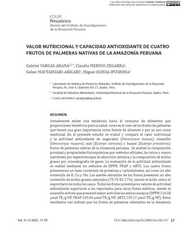 Actualmente existe una tendencia hacia el consumo de alimentos que proporcionen beneficios para la salud, como es el caso de los frutos de palmeras que tienen una gran importancia como fuente de alimento y por su uso como medicinal. En el presente estudio se evaluó y comparó el valor nutricional y la actividad antioxidante de ungurahui (Oenocarpus bataua), sinamillo (Oenocarpus mapora), asaí (Euterpe oleracea) y huasaí (Euterpe precatoria), frutos de palmeras nativas de la Amazonía peruana. Se analizó la composición proximal y propiedades fisicoquímicas por métodos oficiales, los micro y macro nutrientes por espectroscopia de absorción atómica y la composición de ácidos grasos por cromatografía de gases. La evaluación de la actividad antioxidante se realizó mediante los métodos de DPPH, FRAP y ABTS. Los cuatro frutos presentaron un buen contenido de proteínas y carbohidratos, así como un alto contenido de K, Cu y Mn. Los aceites extraídos de los frutos presentan un alto contenido de ácidos grasos saturados (70,78-83,27%), siendo el ácido oleico el mayoritario en todos los casos. Todos los frutos presentaron valores de actividad antioxidante superiores a los reportados para otros frutos exóticos, siendo el sinamillo el fruto que presentó mejor actividad en ambos ensayos (DPPH 116,58 µmol TE/g MF, FRAP 165,04 µmol TE/g MF, ABTS 239,22 µmol TE/g MF). Estos resultados nos indican que los frutos de palmeras colectados en la Amazonía peruana poseen un alto valor nutricional y que pueden ser aprovechados para la elaboración de alimentos funcionales o complementos alimenticios.