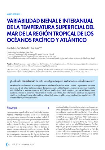 La temperatura superficial del mar (TSM) de los océanos Pacífico y Atlántico tropicales oscila en las bandas de periodos cortos, como ciclos que se repiten cada 2-3 años (bienales) y variaciones que ocurren en intervalos de 3 a 7 años (interanuales). Los cambios de la TSM en los océanos Pacífico y Atlántico provocan cambios en los patrones de temperaturas y lluvias de todo el mundo, pero los más severos están asociados con las del océano Pacífico tropical. Por tanto, el presente avance de investigación busca describir la variabilidad de la TSM de los océanos Pacífico y Atlántico tropicales mediante la identificación de las principales frecuencias en las bandas bienal e interanual aplicando la técnica de ondeletas continua del tipo Morlet l. Para ello se utilizaron las series de tiempo de los índices mensuales de TSM de los océanos Pacífico y Atlántico tropicales para el periodo 1921-2023. Los resultados revelaron que los índices de las regiones Niño 3 y Niño 3.4 son los mejores índices para la TSM del océano Pacífico tropical, ya que ellos presentan un espectro continuo en toda la banda bienal. Por el contrario, la TSM del océano Atlántico norte tropical fluctúa en la banda bienal de periodos largos (2.45 años) y en la banda interanual de periodos cortos (3.46 años).