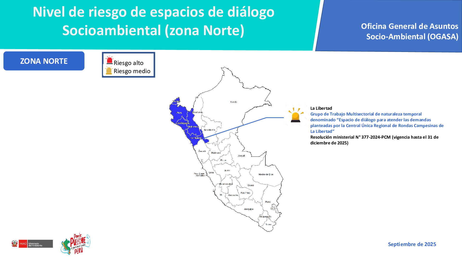La Oficina General de Asuntos Socio-Ambientales (OGASA) publicó un mapa actualizado que evalúa los niveles de riesgo en espacios de diálogo socioambiental a nivel nacional. El informe identifica un caso de riesgo medio.