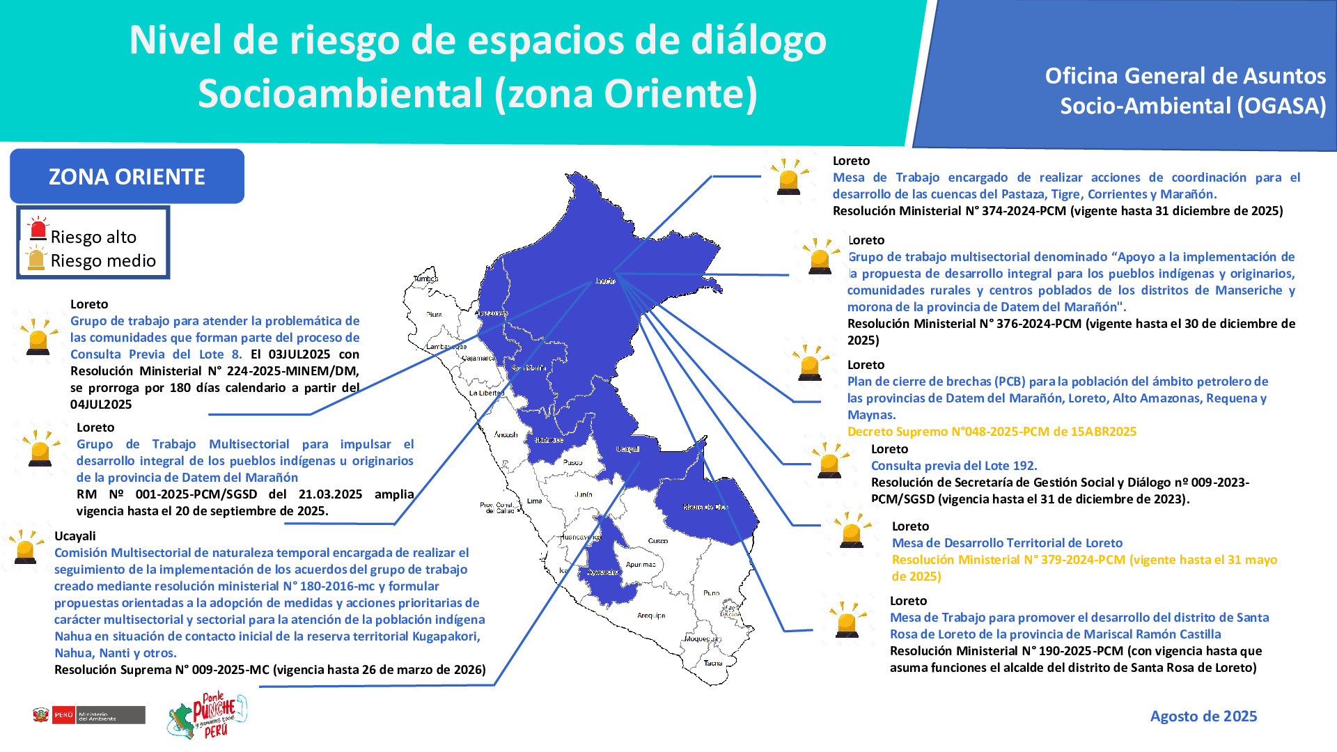 La Oficina General de Asuntos Socio-Ambientales (OGASA) publicó un mapa actualizado que evalúa los niveles de riesgo en espacios de diálogo socioambiental en la Zona Oriente, centrada en Loreto y Ucayali. El informe destaca seis casos de riesgo alto y tres de riesgo medio, asociados principalmente a comunidades indígenas, lotes petroleros y desarrollo en cuencas amazónicas, con vigencias que se extienden hasta 2026 en algunos. Estos mecanismos buscan resolver tensiones por explotación de recursos y derechos territoriales, pero alertan sobre posibles escaladas en áreas vulnerables de la Amazonía.