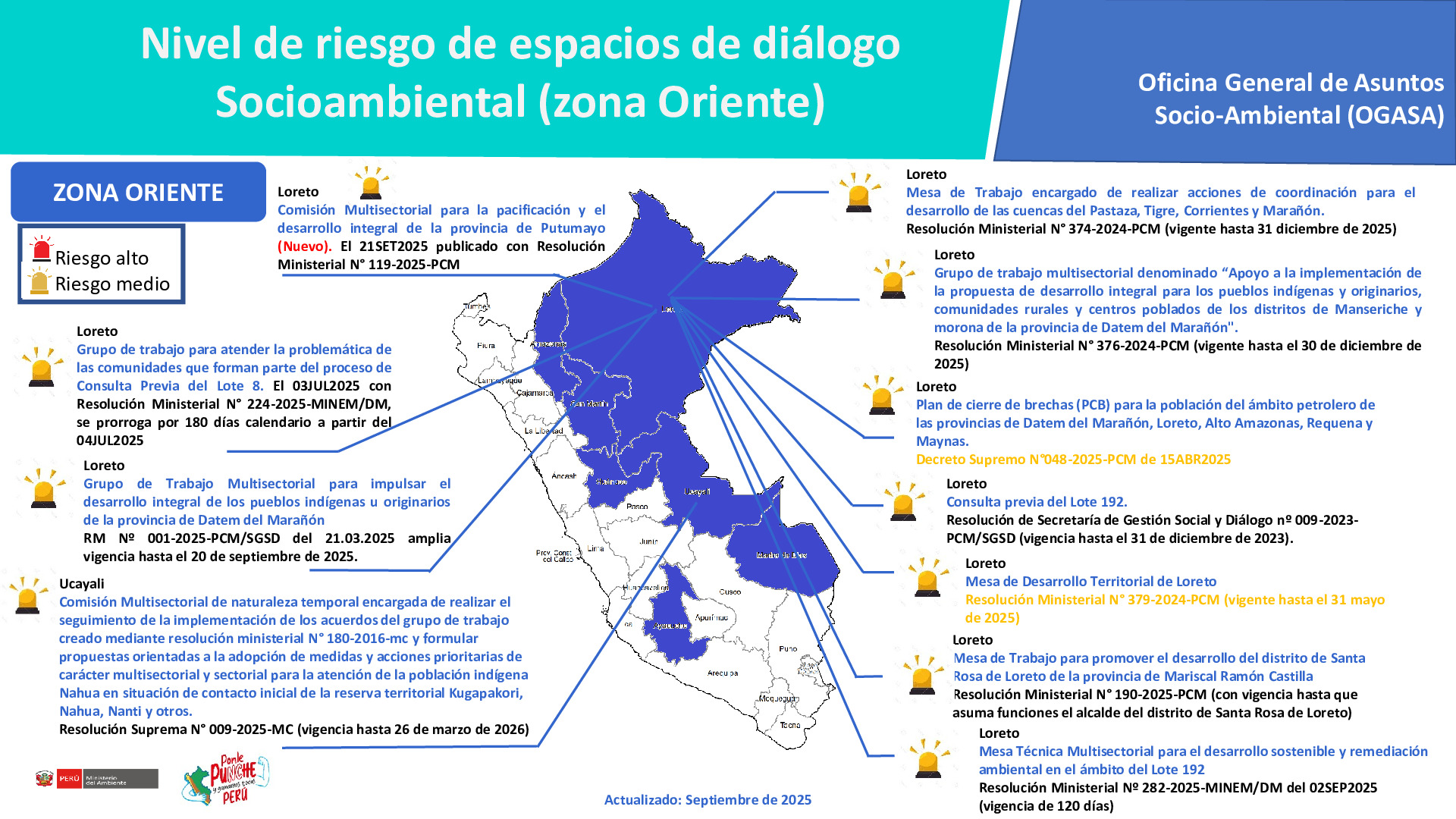 La Oficina General de Asuntos Socio-Ambientales (OGASA) publicó un mapa actualizado que evalúa los niveles de riesgo en espacios de diálogo socioambiental en la Zona Oriente, centrada en Loreto y Ucayali. El informe destaca diez casos de riesgo alto y tres de riesgo medio, asociados principalmente a comunidades indígenas, lotes petroleros y desarrollo en cuencas amazónicas, con vigencias que se extienden hasta 2026 en algunos. Estos mecanismos buscan resolver tensiones por explotación de recursos y derechos territoriales, pero alertan sobre posibles escaladas en áreas vulnerables de la Amazonía.