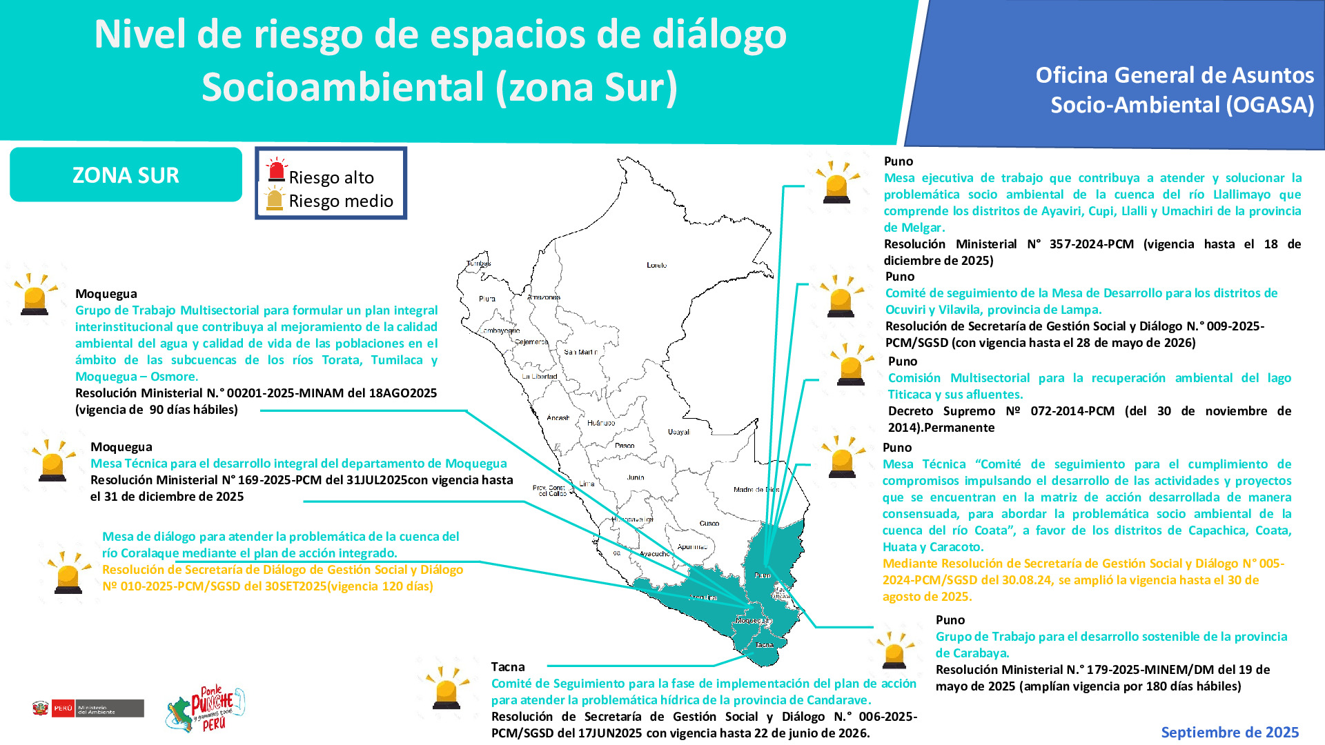 La Oficina General de Asuntos Socio-Ambientales (OGASA) publicó un mapa actualizado que evalúa los niveles de riesgo en espacios de diálogo socioambiental en la Zona Sur, enfocándose en regiones como Puno, Moquegua y Tacna. El informe identifica ocho instancias de riesgo alto y tres de riesgo medio, relacionadas con problemáticas hídricas, ambientales y de desarrollo territorial, muchas vinculadas a cuencas fluviales y lagos, con vigencias que se extienden hasta 2026 en algunos casos.