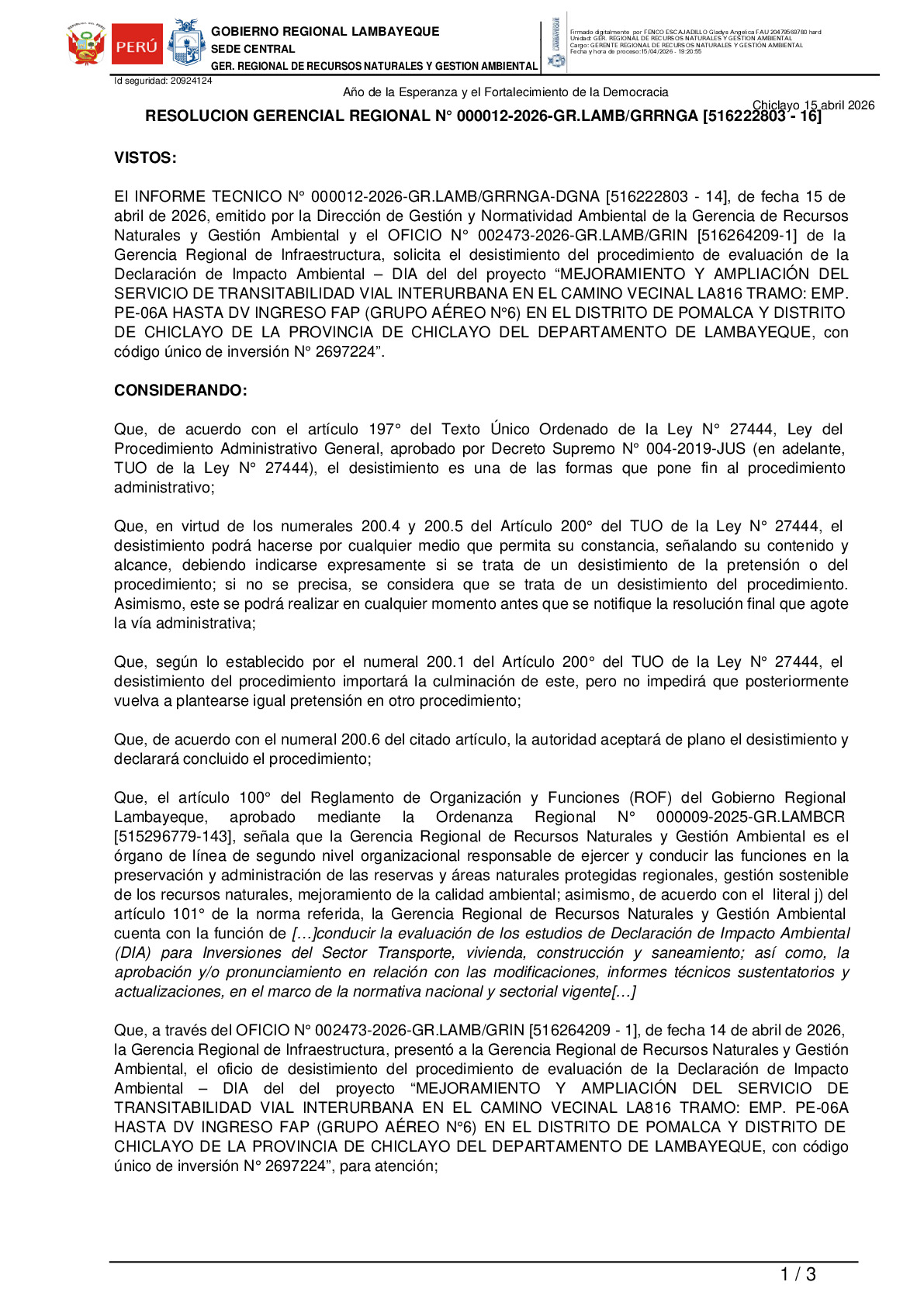 Aceptar el desistimiento y, en consecuencia, dar por concluido el procedimiento de evaluación de la Declaración de Impacto Ambiental – DIA del proyecto “Mejoramiento y ampliación del servicio de transitabilidad vial interurbana en el camino vecinal LA816, tramo: emp. PE-06A hasta DV ingreso FAP (Grupo Aéreo N.° 6), en el distrito de Pomalca y distrito de Chiclayo, provincia de Chiclayo, departamento de Lambayeque, con código único de inversión N.° 2697224”.