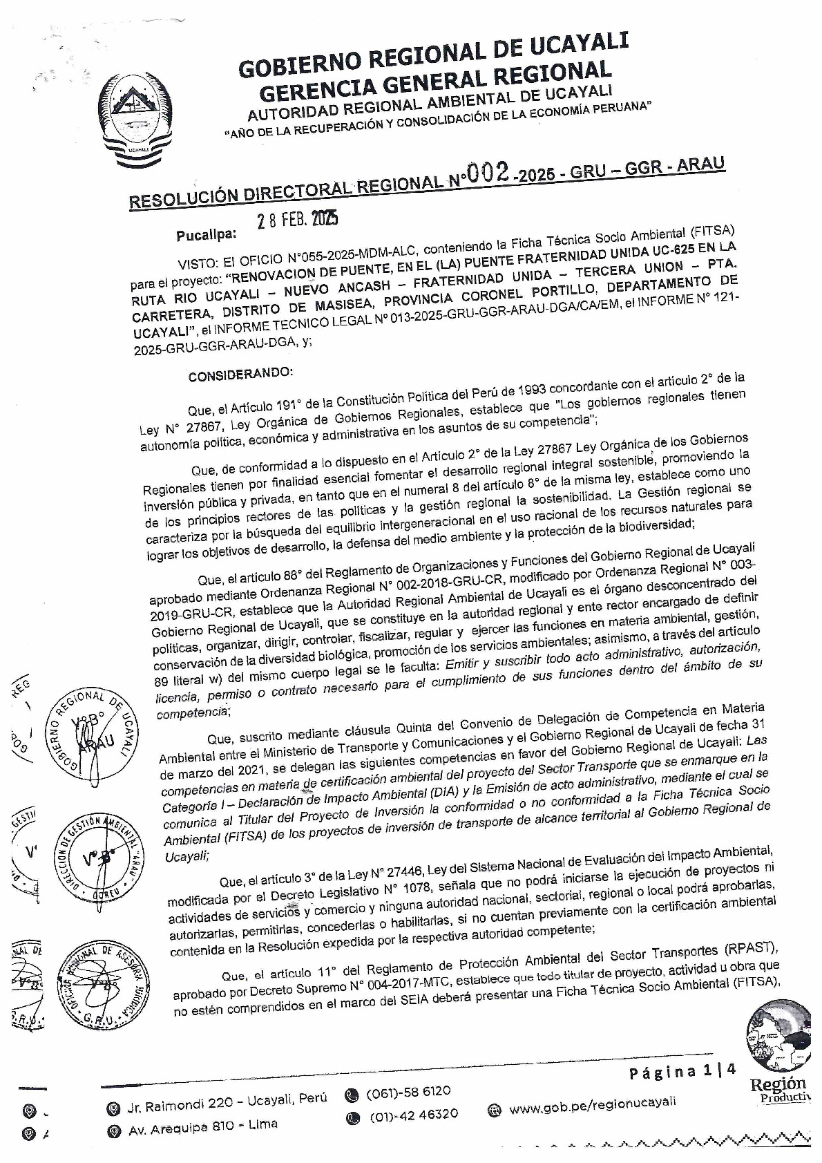 La Autoridad Regional Ambiental de Ucayali, mediante R.D.R. 002-2025-GRU-GGR-ARAU, otorga la conformidad a la Ficha Técnica Socio Ambiental - FITSA, para el proyecto: "Renovación de Puente en el puente Fraternidad Unida UC-625, en la ruta río Ucayali - Nuevo Ancash - Fraternidad Unida - Tercera Unión - Pta. Carretera, distrito de Masisea, Provincia de Coronel Portillo, Departamento de Ucayali, presentada por la Municipalidad Distrital de Masisea.