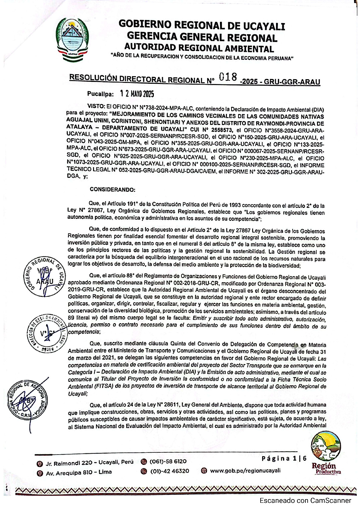 Mediante Resolución Directoral Regional Nº 018-2025-GRU-GGR-ARAU, el Gobierno Regional de Ucayali a través de la Autoridad Regional Ambiental, Aprobar la Declaración de Impacto Ambiental - DIA, del proyecto: "Mejoramiento de Caminos Vecinales de las CC.NN. Aguajal Unini, Corintoni, Shenontiari y Anexos del Distrito de Raymondi, Provincia de Atalaya, Dpto. de Ucayali. CUI 2558573.