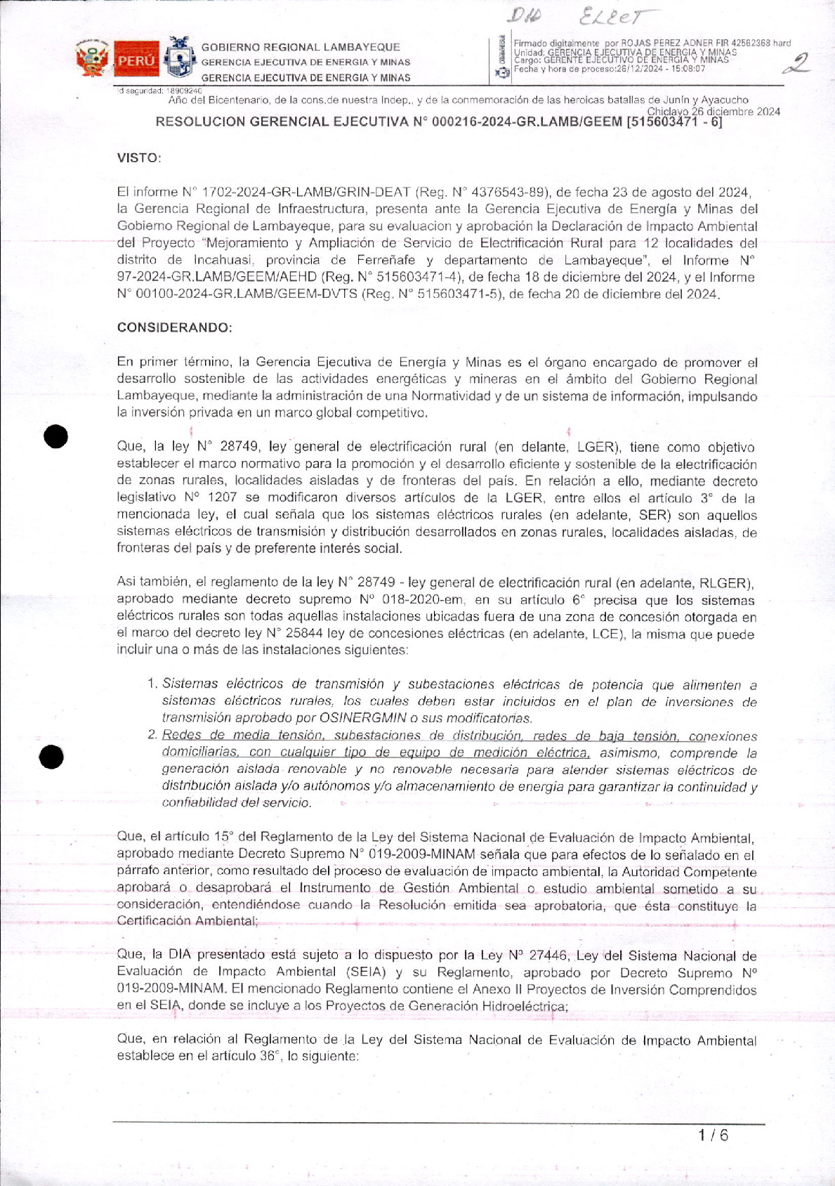 Aprobación la Declaración de Impacto Ambiental del Proyecto “Mejoramiento y Ampliación de Servicio de Electrificación Rural para 12 localidades del distrito de Incahuasi, provincia de Ferreñafe y departamento de Lambayeque”
