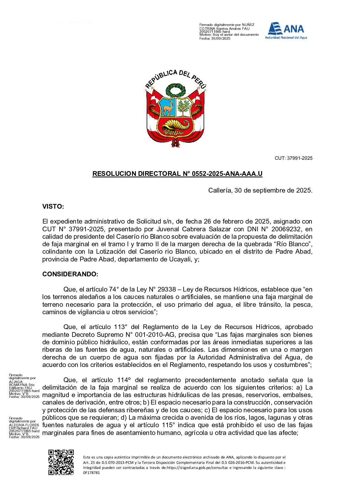 Mediante Resolución Directoral Nº 0552-2025-ANA-AAA.U, el Director de la Autoridad Administrativa del Agua de Ucayali, Aprueba la Delimitación faja marginal en el tramo I y tramo II de la margen derecha de la quebrada “Río Blanco”, en una longitud de 186.41 m. en el tramo I del vértice FMD01 – FMD03 con un ancho variable de 5.00 – 5.50 m, y en una longitud de 41.96 m. el tramo II del vértice FMD01 – FMD05 con un ancho variable de 5.00 – 10.00 m; y puntos de monumentación en el tramo I del H1 al H3, y en el tramo II del H1 al H5, presentado por Juvenal Cabrera Salazar con DNI N° 20069232, en calidad de presidente del Caserío rio Blanco colindante con la Lotización del Caserío rio Blanco, ubicado en el distrito de Padre Abad, provincia de Padre Abad, departamento de Ucayali