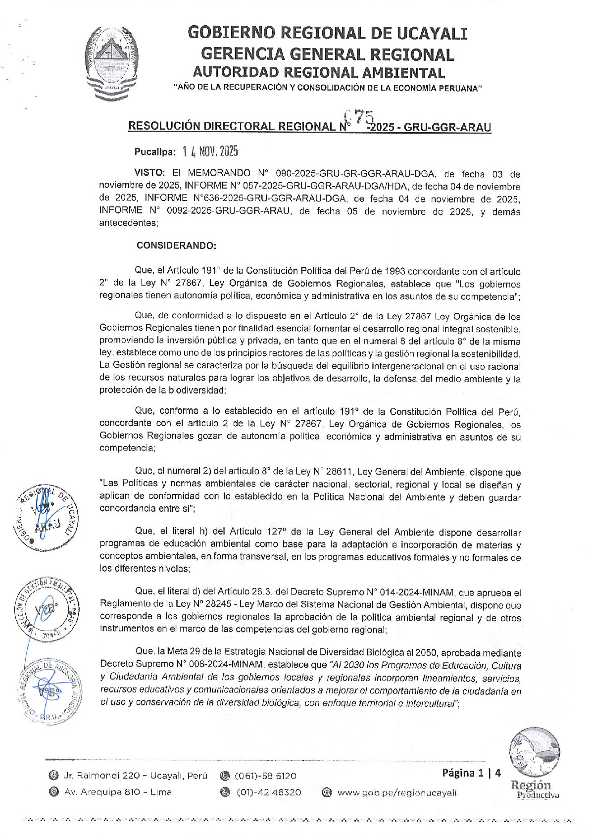 El Gobierno Regional de Ucayali a travez de la Auroridad Regional Ambiental, aprueba la RDR N° 075 -2025-GRU-GGR-ARAU; en la cual se aprueva Plan de Trabajo anual 2025, del Programa Regional de Educacion, Cultura y Ciudadania de Ucayali; establecido con Ordenanza Regional N° 003-2025-GRU, de la Matriz.