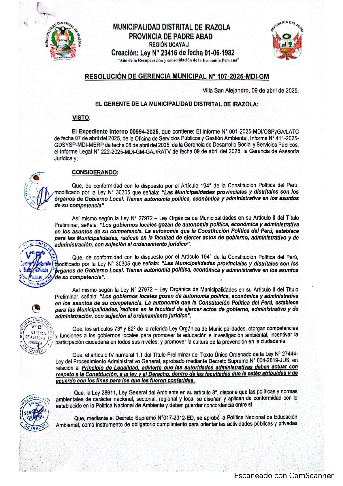 Mediante Resolución de Gerencial Municipal, se aprueba el Plan de Trabajo del "Programa Municipal de Educación, Cultura y Ciudadanía Ambiental, de la Municipalidad Distrital de Irazola - EDUCCA 2025, que mediante Ordenanza Municipal N°006-2023-CM-MDI-VSA de fecha 17 de marzo del 2023, aprueba el Programa Municipal de Educación, Cultura y Ciudadanía Ambiental, y para el cumplimiento de las líneas de acción señaladas, se realizarán diversas actividades que contribuyan a cumplir las metas establecidas en la Política Nacional del Ambiente al 2030 correspondiente al objetivo prioritario N° 9 y otros dispositivos legales relacionados con el Programa Municipal EDUCCA. Bajo este enfoque, la oficina de servicios públicos y gestión ambiental, presenta el Plan de Trabajo 2025 del Programa Municipal de Educación, Cultura y Ciudadanía Ambiental, como herramienta de gestión indispensable para la ejecución de las actividades de educación, cultura y ciudadana ambiental.