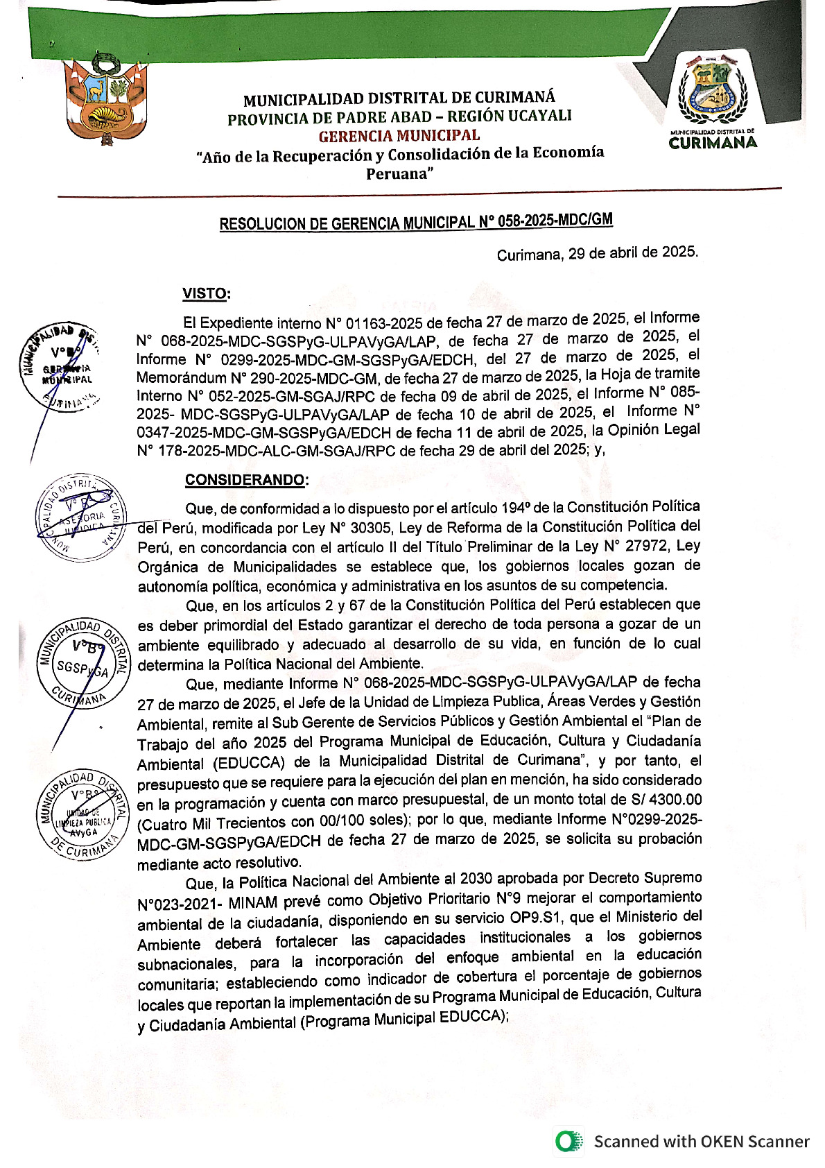 Mediante Resolución de Gerencial Municipal, se aprueba el Plan de Trabajo del "Programa Municipal de Educación, Cultura y Ciudadanía Ambiental, de la Municipalidad Distrital de Curimaná - EDUCCA 2025, mediante Ordenanza Municipal N° 001-2023-MDC de fecha 23 de marzo del 2023, la Municipalidad Distrital de Curimaná, aprueba el Programa Municipal de Educación, Cultura y Ciudadanía Ambiental, y para el cumplimiento de las líneas de acción señaladas, se realizarán diversas actividades que contribuyan a cumplir las metas establecidas en la Política Nacional del Ambiente al 2030 correspondiente al objetivo prioritario N° 9 y otros dispositivos legales relacionados con el Programa Municipal EDUCCA. Bajo este enfoque, la oficina de servicios públicos y gestión ambiental, presenta el Plan de Trabajo 2025 del Programa Municipal de Educación, Cultura y Ciudadanía Ambiental, como herramienta de gestión indispensable para la ejecución de las actividades de educación, cultura y ciudadana ambiental.