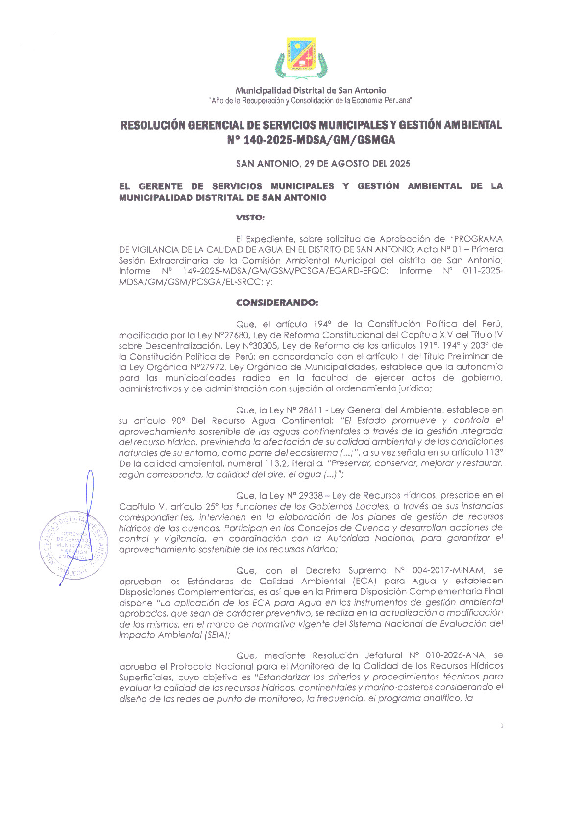 Aprobación del Programa de Vigilancia de la Calidad de Agua en el Distrito de San Antonio