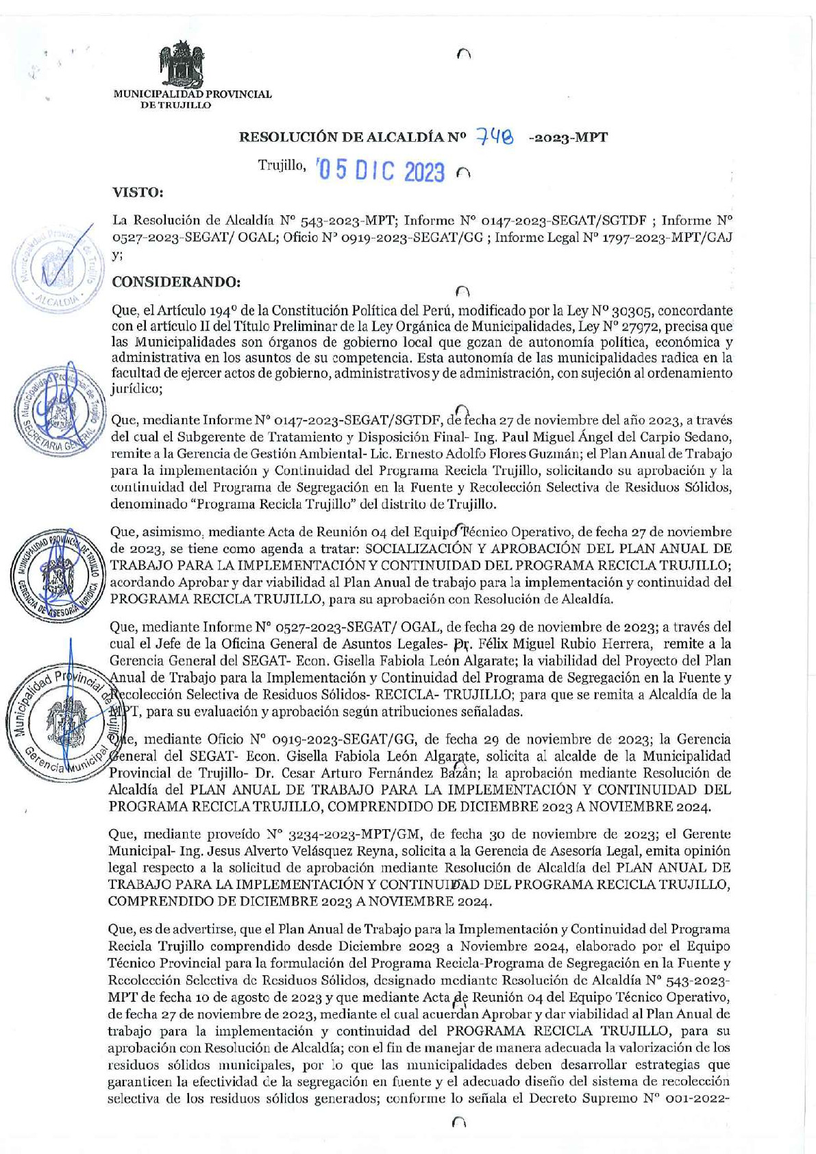 APROBAR EL PLAN ANUAL DE TRABAJO PARA LA IMPLEMENTACIÓN Y CONTINUIDAD DEL PROGRAMA RECICLA TRUJLLO comprendido de Diciembre 2023, a Noviembre 2024, que como anexo forma parte integrante de la Resolución.