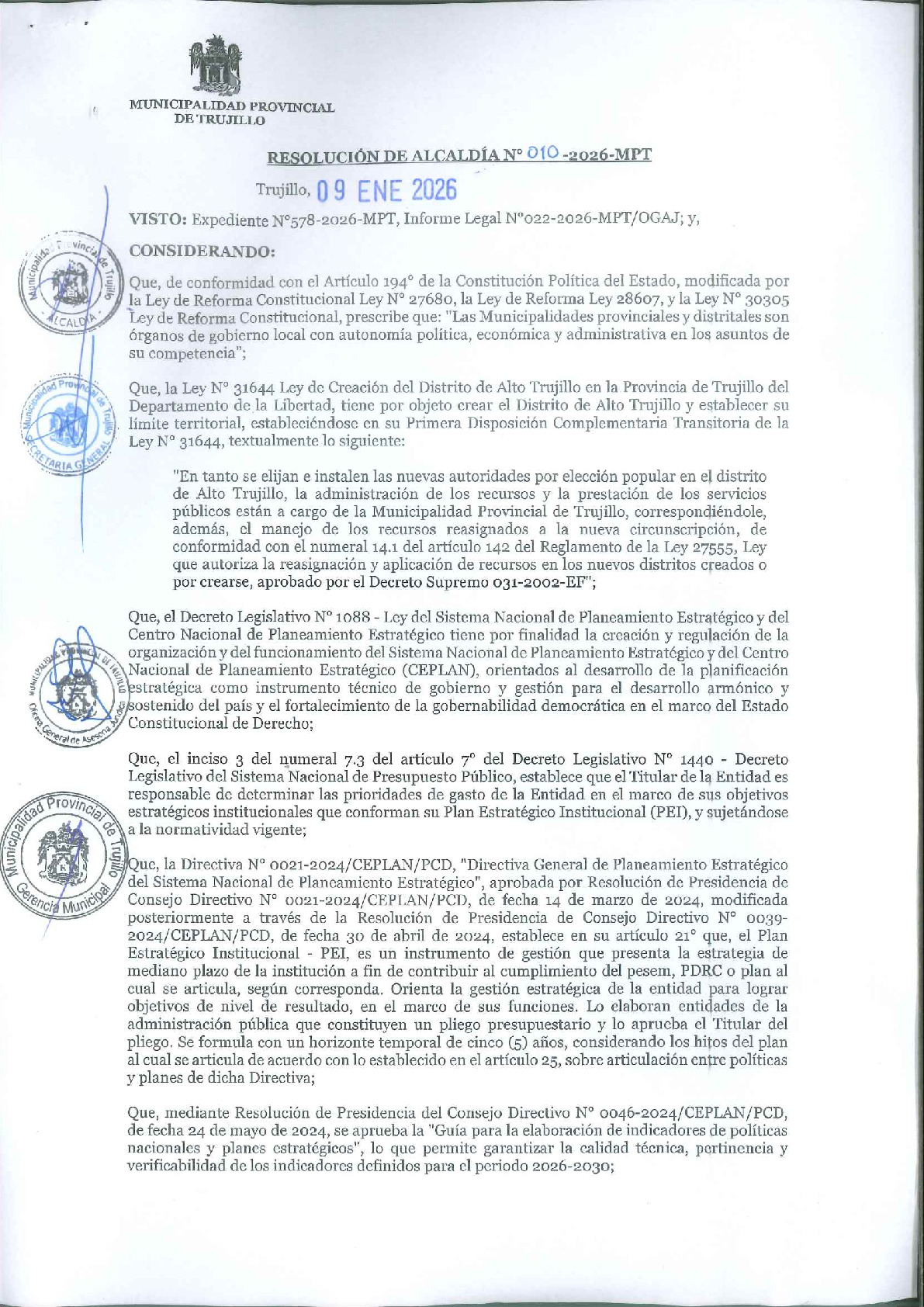 Aprobar el Plan Estratégico Institucional PEI 2026-2030 de la Municipalidad Distrital de Alto Trujillo