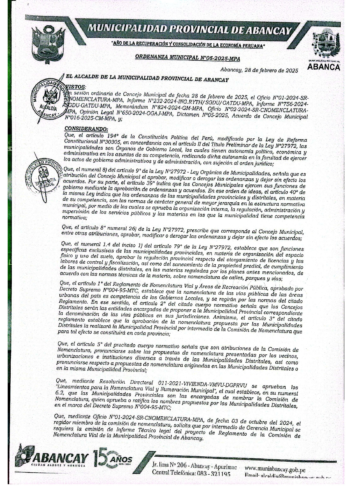 Articulo 1º.- Aprobar, el Reglamento de la Comisión de Nomenclatura Vial de la Municipalidad Provincial de Abancay, el mismo que consta de cinco (5) títulos, quince (4) articulos y tres (4) disposiciones complementarias y finales, que forman parte integrante de la presente ordenanza.